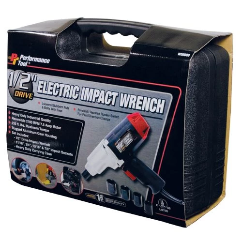 Performance Tool 1/2 in. Drive Electric Impact Gun Set includes a 1/2 in. drive impact wrench, 11/16 in., 3/4 in., 13/16 in., and 7/8 in. impact sockets and a heavy duty carrying case.