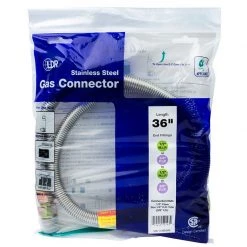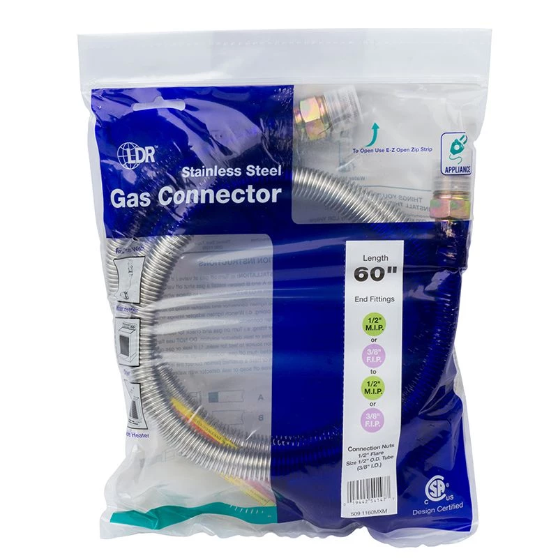 LDR Flexible Gas Connector is a 1/2 in. O.D. (3/8 in. I.D.) stainless steel tube for use on water heaters, dryers and space heaters. Meets ANSI Z21.24 & Z21.45.
