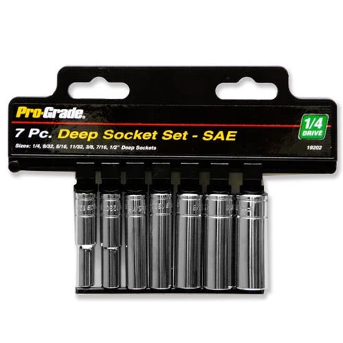Pro-Grade 1/4 In. Dr. SAE Deep Wall Socket Set 7 Pc. features a variety of standard sockets made from drop forged, hardened chrome vanadium steel for strength and durability. These sockets are designed with chamfered and recessed leading edges to provide the most positive fit possible. The exclusive Dyna-Drive Torque System allows up to 20% more driving torque with no slippage or fastener damage.