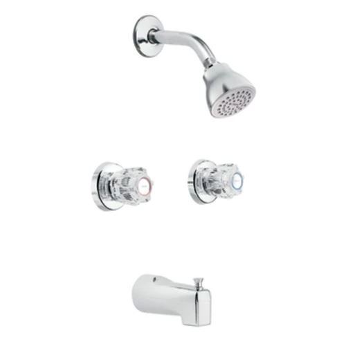 Moen Adler Tub and Shower Faucet Set offers a classic style and one?handle convenience. There is a chrome finish to create a bright, highly reflective, cool grey metallic look. The set includes a 2 knob control, shower head and tub spout included.