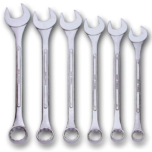Harvest Forge Jumbo Wrench Set 6 Pc. features big wrenches for big fasteners! The box end on these super-sized wrenches gives you a sturdy grip on fasteners, while the other end works like an open-end wrench to reach fasteners in tight spaces. Twelve points on the box end help you grab hold of the fastener quicker. The open-end heads and 12-point chamfered box ends are offset by 15°. Sizes are stamped on the raised panel.