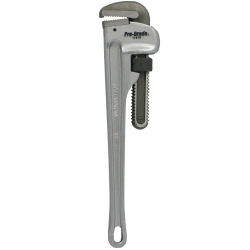Pro-Grade Aluminum Pipe Wrench 18 In. is the perfect heavy duty wrench for all your plumbing needs. It features spring-loaded jaws made from drop-forged carbon steel. It is triple chrome plated for corrosion resistance.