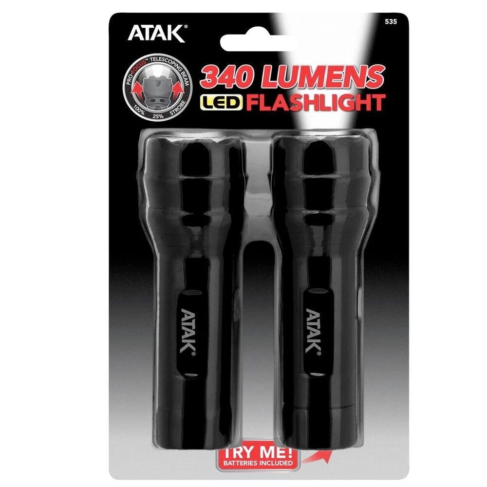 Atak LED Flashlight Set features professional grade lifetime LED and aircraft grade aluminum construction. There are 3 output settings: 25%, 100%, and Strobe.