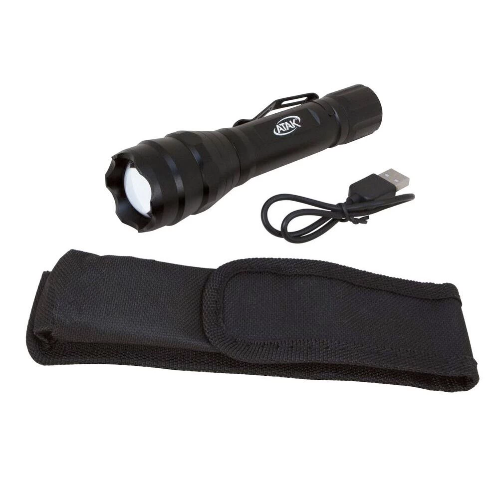 Atak Rechargeable LED Flashlight uses a professional grade Cree lifetime LED. This is a Pro-Focus flashlight with 2 functions: High and Low.