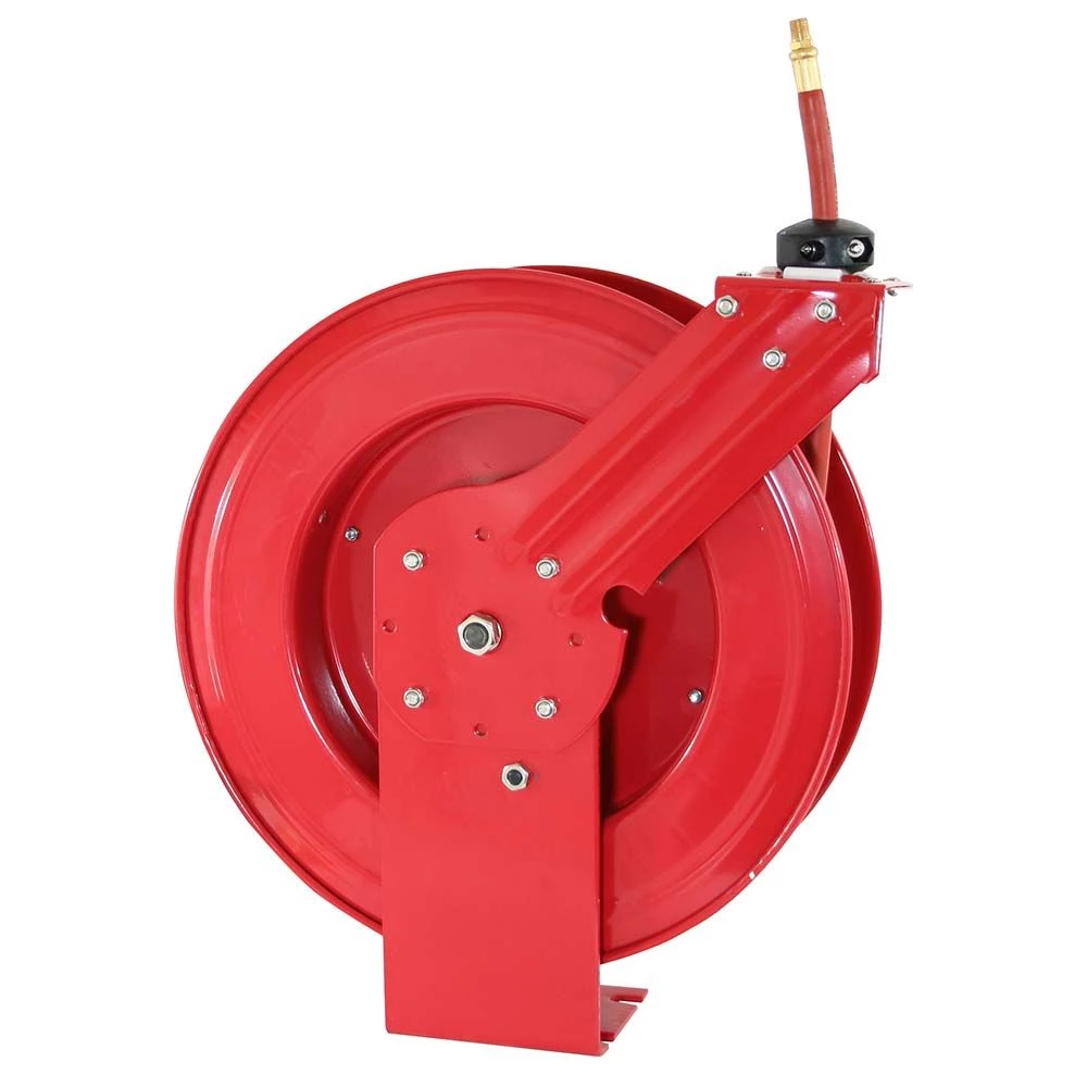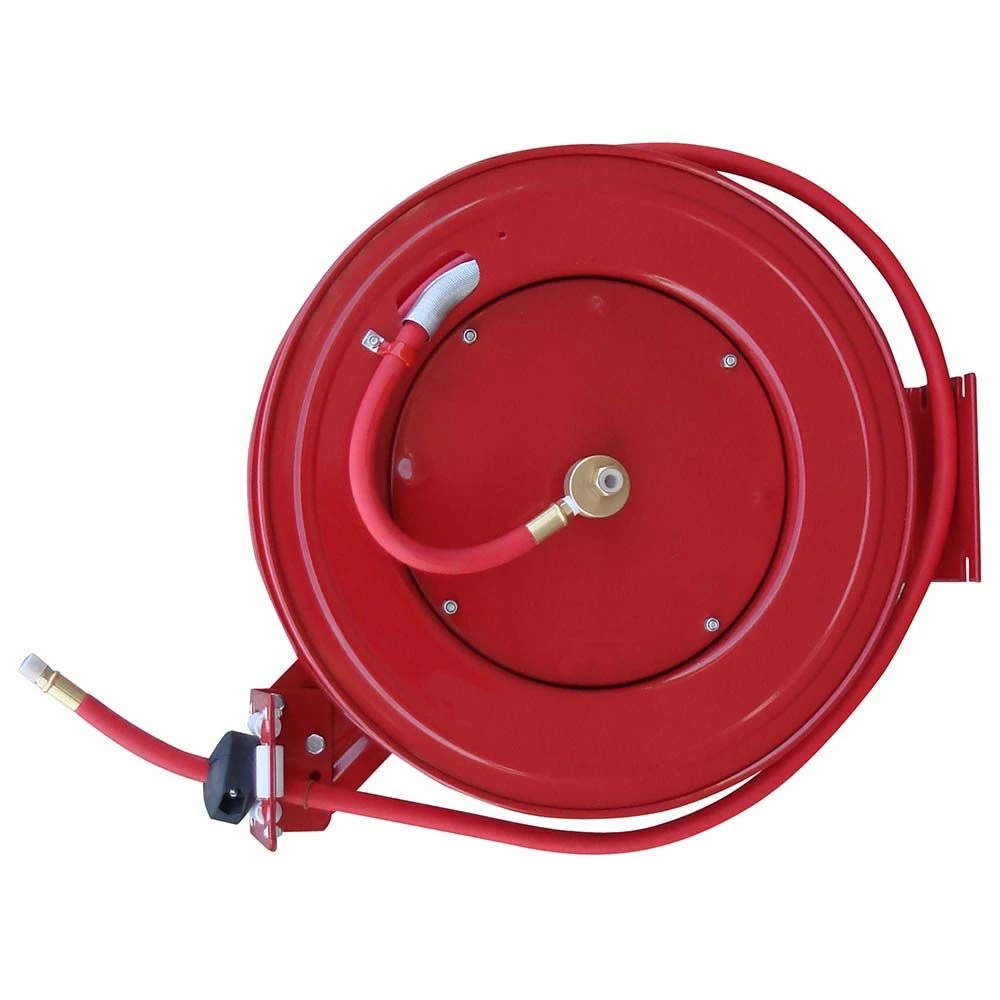 You won’t be tripping over your hose while working in the shop with the Black Bull 50 Foot Retractable Air Hose Reel with Auto Rewind. The heavy gauge steel reel assembly can be mounted on the ceiling, wall, or floor for quick and easy connection to your air compressor in your workshop, garage or basement. To use, simply pull the hose out to the desired length, and the ratchet gear will lock the hose in place and prevent backward tension while working. When you are done, give the hose a gently tug to unlock and let the hose gently roll away. The 3/8-inch diameter air hose it constructed of heavy-duty rubber that gives it a working pressure of 300 psi.