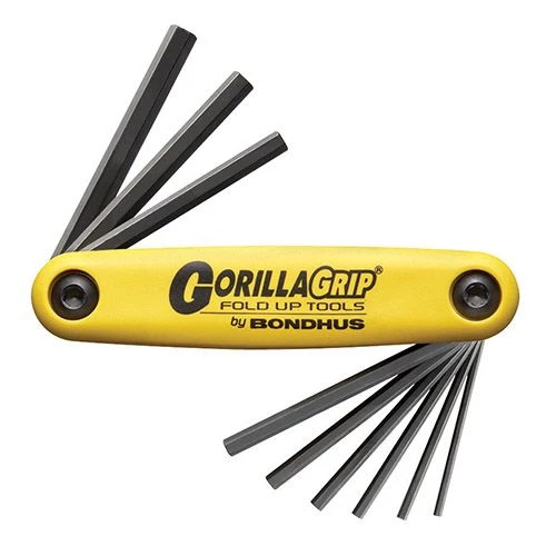 Bondhus GorillaGrip® Fold-Up Hex Key Tool 5/64 In. – 1/4 In. is a handy set of standard hex keys with chamfered tool tips that eliminate burrs and help the tool seat in screw head. This tool opens from the top and bottom. There are patented spacers between tools. The handle is 40% stronger than steel and will not rust or corrode. It is comfortable to hold and does not conduct heat or cold. The blades open up to 270° from the handle and a molded in stops then holds the blades in securely in place. With a blade in the 180° position, a fold-up can be used like a screwdriver. With a blade in the 270° position, a fold-up can be used for spinning a fastener in or out.