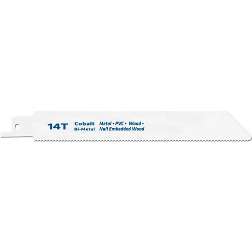Century Drill & Tool CIP-Saw Cobalt Bi-Metal Reciprocation Saw Blades are designed for contractor grade applications. Each blade consists of cobalt alloy high speed steel teeth, electron beam welded to a lower alloy backbone, provide a flexible, high performance blade. Cip-Saw Blades have C66-67 Rockwell hardened teeth which operate up to 10X faster than carbon alloy blades. The 1/2 in. universal shank fits all popular USA reciprocating saws.