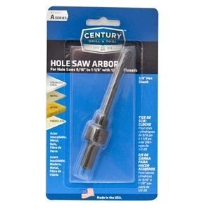Century Drill & Tool A Style Bi-Metal Hole Saw Arbor has a 3/8 in. shank and fits bi-metal hole saws 5/8 in. – 1-1/8 in..