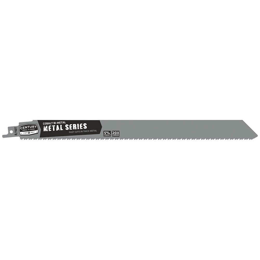The Century Drill & Tool Reciprocating Saw Blades are professional bi-metal blades with cobalt high speed steel teeth and shatterproof shock absorbing alloy backbone. 1 inch width and heavy duty blade thickness for clean cuts with less vibration in heavy metal cutting applications. 1/2inch universal shank with 5% tilt angle for faster cuts and skid free starts. Lasts 20X longer than standard bi-metal blades in metal applications.
