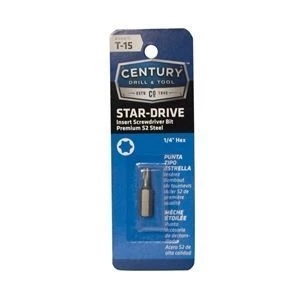 Century Drill & Tool T15 Star Insert Screw driving Bit is made from premium S2 steel for long tool life while driving common or mild steel screws or case hardened screws.