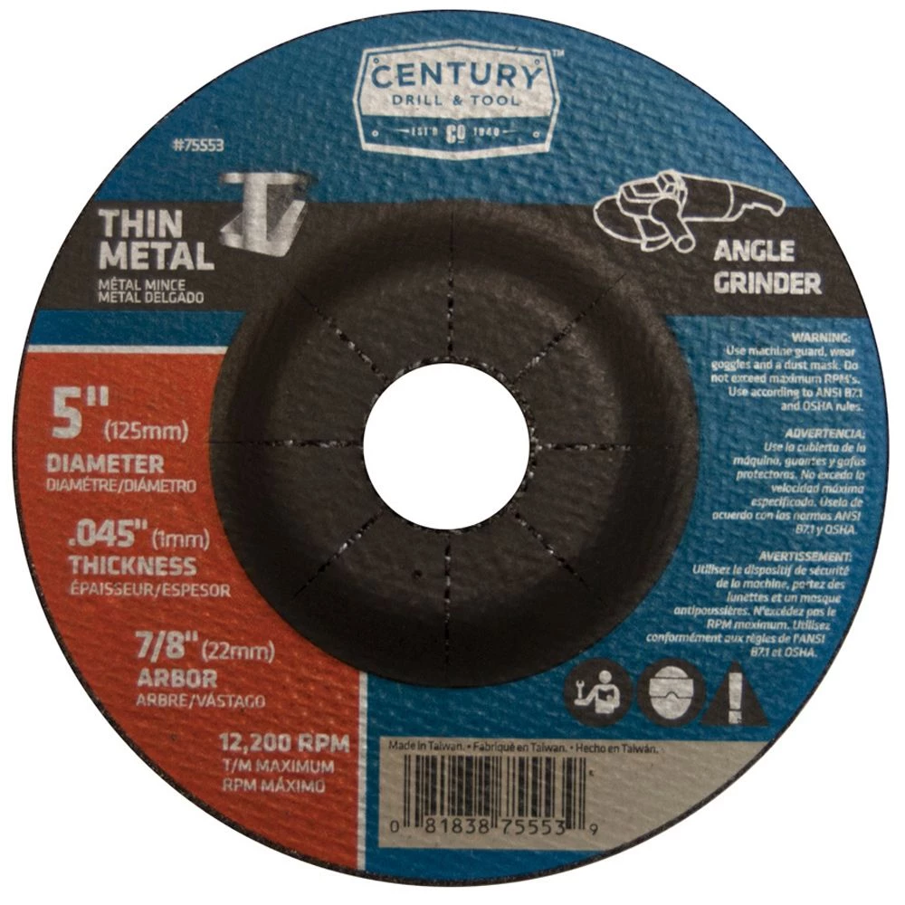 This Thin Metal Grinding Wheel from Century Drill & Tool is for use on thin metal. The aluminum oxide grit and premium resin bond provide professional results. For use in angle grinder.