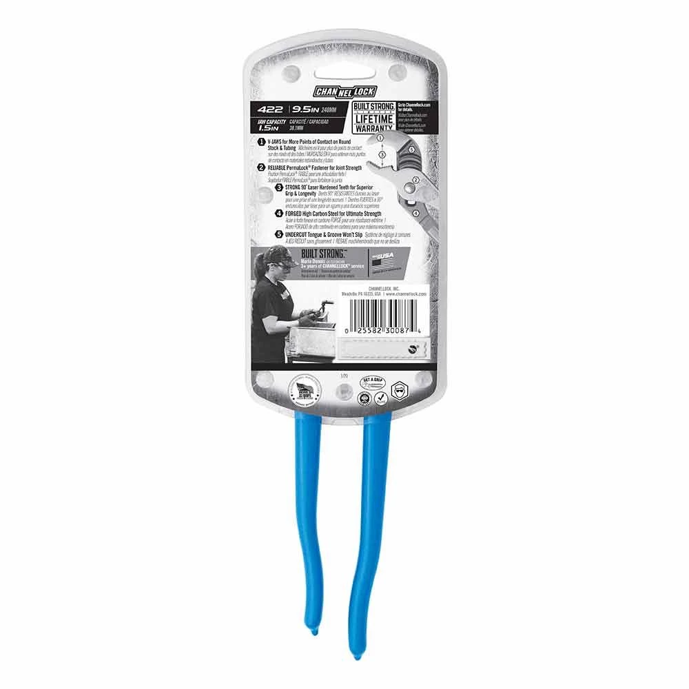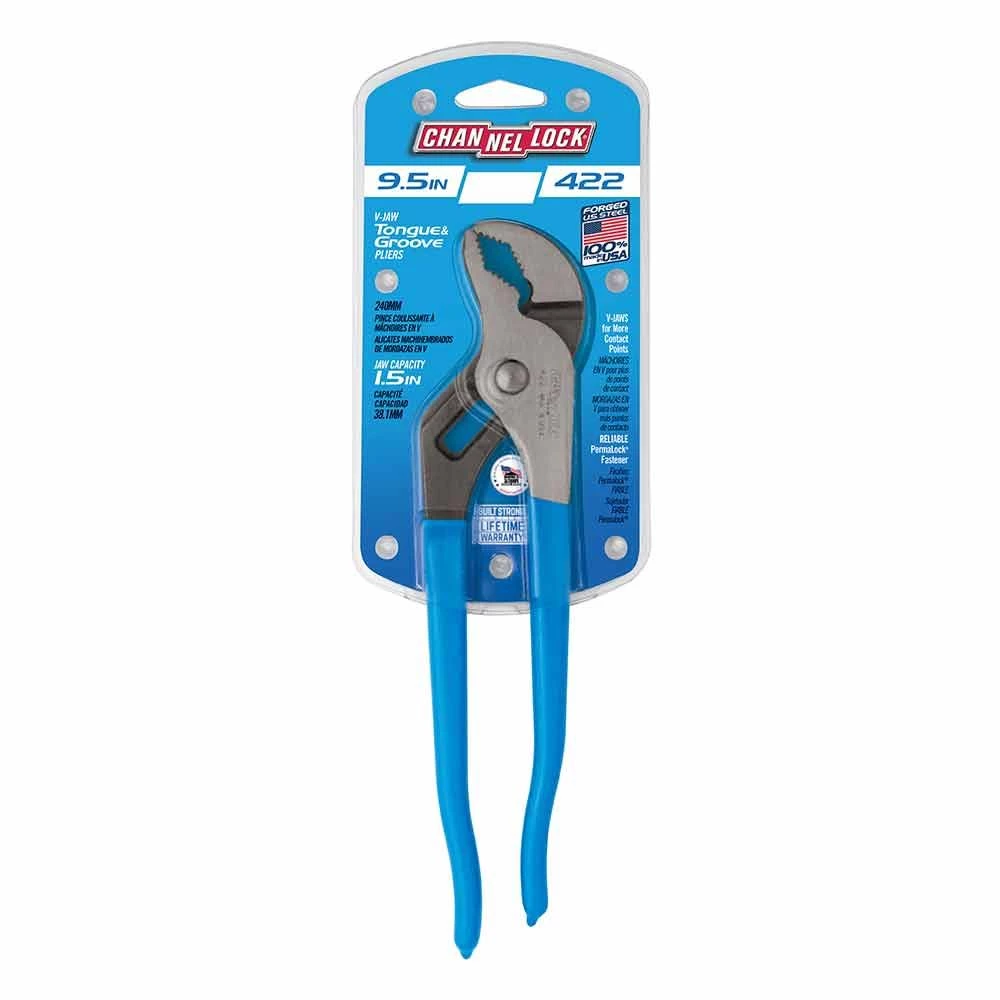 CHANNELLOCK® 9.5 In. Tongue & Groove Pliers have a unique v-jaw design that creates more points of contact on round stock and tubing. These pliers are built to last with a PERMALOCK® fastener to eliminate nut and bolt failure, patented reinforcing edge to minimize stress breakage and laser-hardened teeth to provide a better, longer lasting grip. CHANNELLOCK® V-Jaw Pliers are made in USA and forged from high carbon U.S. steel that is specially coated for ultimate rust prevention. CHANNELLOCK BLUE® grip provides comfort.