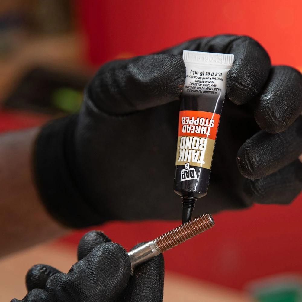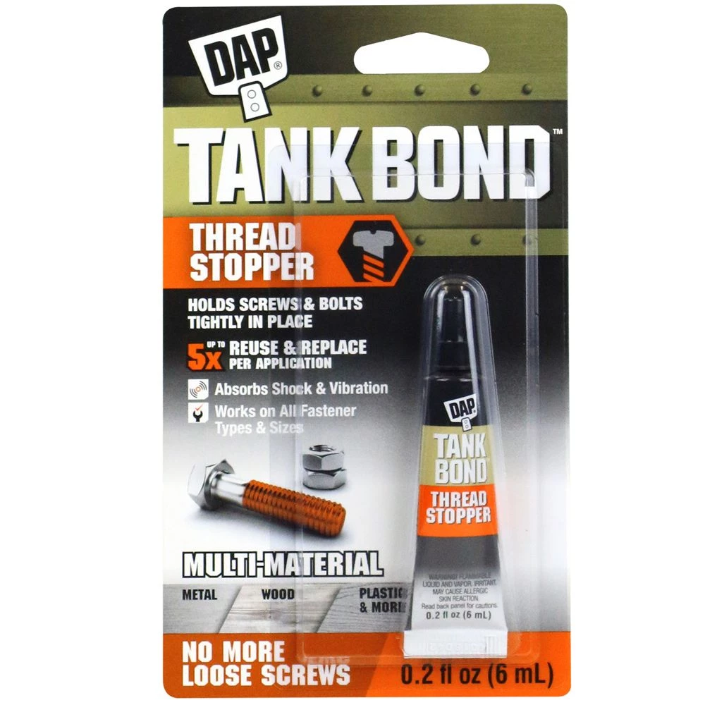 DAP Tank Bond Thread Stopper holds screws and bolts tightly in place so you can fix any loose screw. The fast-dry coating creates a tight seal that absorbs shock and vibrations preventing fasteners from unintentionally backing out of wood, metal, and plastic. Simply apply Thread Stopper to screw threads, let it dry, and install the screw into place. Treated fasteners remain completely adjustable, removable and reusable.