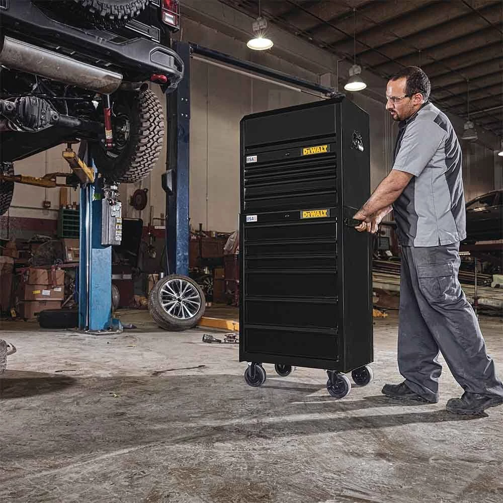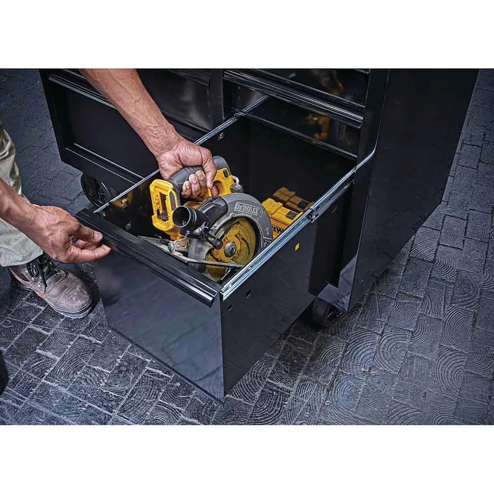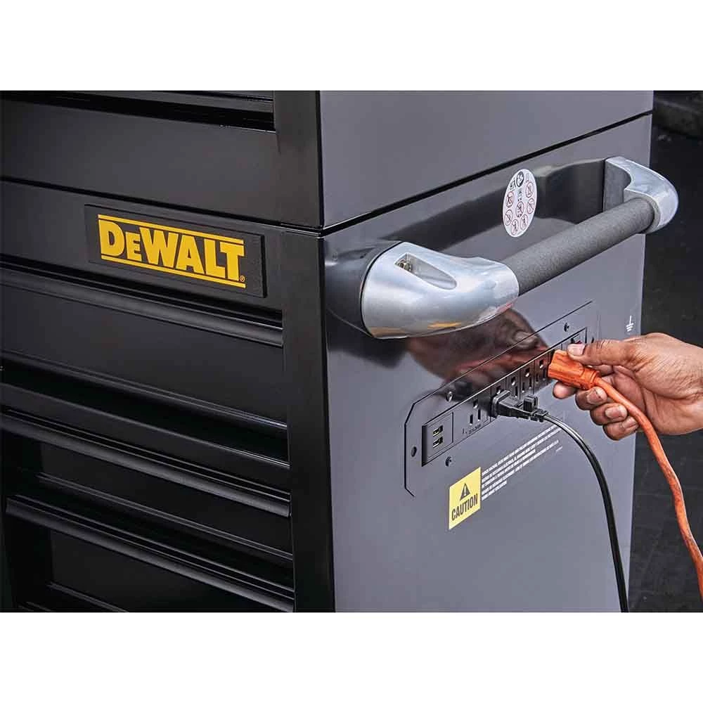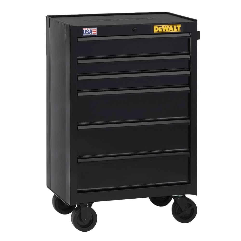 DeWalt 26-inch wide 6-Drawer Rolling Tool Cabinet is constructed of double-wall steel for strength and durability. It has six 100-pound load capacity drawers with soft close latching for smooth and quiet operation. It also has a heavy-duty keyed internal locking system to safeguard tools. Conveniently charge your power tools, batteries, and electronics from the side of the cabinet. Its load rating is 1,500 pounds with reinforced mounting channels and it has four 5-inch x 2-inch casters, two of which lock and swivel. A full-grip tubular side handle with a comfortable black overmold is included for ease of mobility. Also included are six DEWALT embossed drawer liners and one DEWALT embossed top mat to help protect the cabinet surface. Recommended with this unit is our 700 Series 26-inch wide 6-Drawer Tool Chest (DWST22644), sold separately. Look no further than our Metal Tool Storage line for your tool storage and organization needs. Choose from a variety of sizes in top tool chests and rolling tool cabinets, all of which are made of 18-20 gauge steel. All units have an 18-inch depth to fit our mechanic tools sets, and other hand tools and accessories.