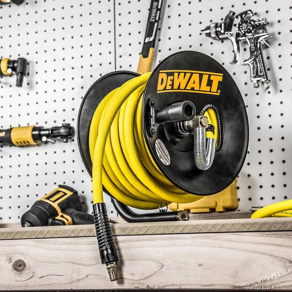 DEWALT Manual Hose Reel 3/8 In. x 50 Ft. is suitable for industrial, contractor, or household use. It is equipped with a quick release pin lock for easy removal from wall or workbench and is designed to keep your air hose neatly wrapped for quick smooth pull-down operation. The rubber air hose stays flexible to work with, even at 40°F below zero, yet still takes the heat up to 150°F without swelling or bubbling. The bend restrictor provides ease of use and hose protection. The hose is kink-resistant under pressure and has a 3/8 in. x 4 ft. lead in the air hose for easy compressor connection. The DEWALT 3/8 in. x 50 ft. Manual Hose Reel is the perfect accessory for any air tool and any air compressor that operates at 300 psi or less.