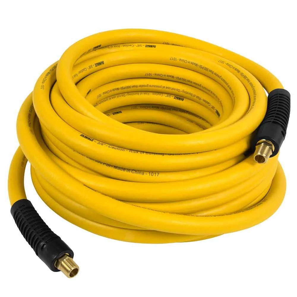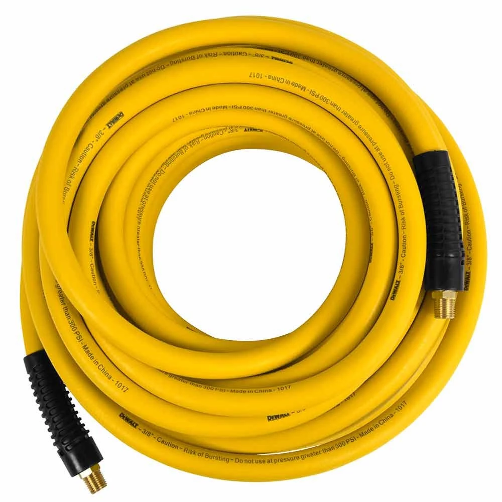 DEWALT Premium Rubber Hose 3/8 In. x 50 Ft. is durable and perfect for all compressor activities. This air hose stays flexible to work with, even at 40°F below zero, yet still takes the heat up to 150°F without swelling or bubbling. The hose is kink and oil resistant under pressure. This rubber hose comes complete with solid brass 1/4 in. NPT male end fittings which never corrode and bend restrictors that prevent hose kinking and reduce wear and tear, prolonging the life of the hose. The DEWALT 3/8 in. x 50 ft. Premium Rubber Hose is the perfect accessory for any air tool and any air compressor that operates at 300 PSI or less.