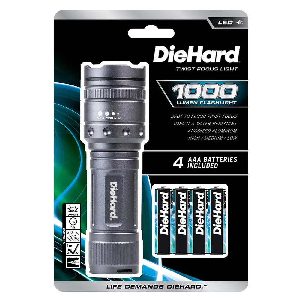 DieHard® 4AAA Twist Focus Flashlight features durable Pro Grade anodized aluminum construction for a quality feel and finish you have to feel to believe. This light’s Twist Focus technology allows you to focus the light from a spot beam, all the way to a flood beam, and any point in between. Light settings of high, medium, and low mean you will always have the right amount of light for a given task. A flash setting is also included for safety. This light is also durable, with impact and water resistant design, rubber booted tail cap switch, and a heavy duty, non-slip True Grip handle. Other features include 1 hour of run time on 4 AAA batteries and a 130 meter beam distance. This light is also designed to stand on its end for hands free lighting. The DieHard Twist Focus Light includes four premium DieHard AAA batteries.