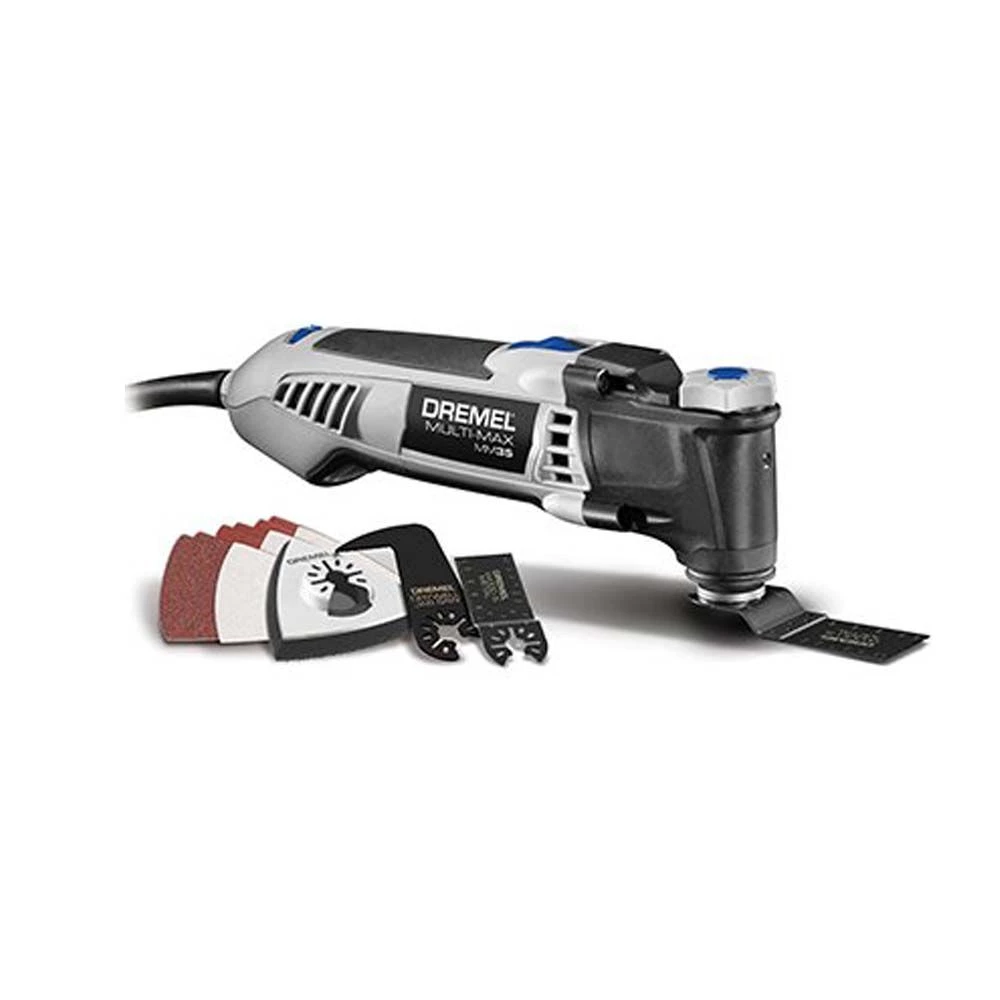 The Dremel Multi-Max™ MM35 features 3.5 Amp of power to easily tackle the toughest applications. The tool-less innovative design for Quick and secure accessory change solves the pain point of needing a wrench to perform the same operation. The Extra-wide 3.2-Degree angle of oscillation delivers fast and precise cuts. The variable speed 10, 000-21, 000 OPM allows for optimal performance and control with a variety of materials. Includes MM435 Drywall Jab Saw, MM428 Wood & Metal Flush Cut Blade, MM14 Hook & Look Pad, MM70 W Sanding Sheets (x6), MM70P Sanding sheets (x3), Storage Bag.