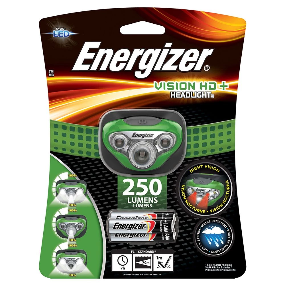 Energizer® Vision HD+ LED Headlight keeps your hands-free. Comfortable, secure and durable, these headlamps area perfect solution for any jobs and activities that demand the use of both hands. There are four headlamp light modes: White spot light, White flood light, Spot and flood together, and Red for night vision. It is dimmable to control brightness and runtime (excluding night vision). The powerful LED headlight beam is up to 4X brighter than standard LED technology. It is water resistant and drop tested to stand up to harsh conditions. The pivoting heads allows you direct the headlamp light where needed.