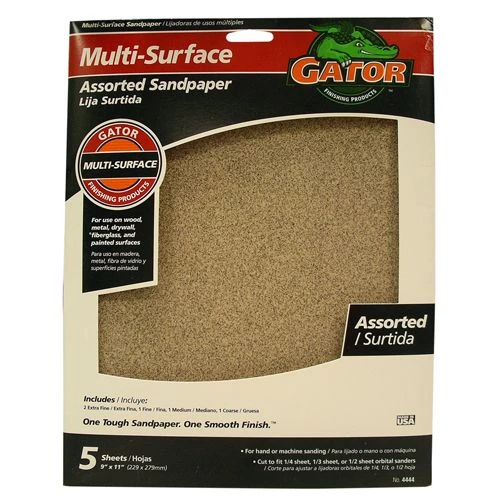 Gator® Finishing Products Assorted Multi-Surface Sandpaper 5 Pcs. is professional quality sandpaper that resists heat and humidity. It is made with heavy-grade paper that resists tearing. Applications include wood, metal, drywall, fiberglass or painted surfaces.