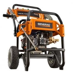 Generac Pressure Washer 4200 PSI 12 in. pneumatic wheels and professional-grade spray gun complement the powerful 420cc Generac OHV horizontal-shaft engine and professional-grade triplex pump. And with a long 50 ft. non-marring rubber hose, you'll be ready to take on even the biggest cleaning jobs. Pro-Grade Triplex Pump has features like ceramic-coated pistons, it is designed for rugged long life. The welded roll cage frame protects components & provides gripping surfaces for easier lifting. A powerful Generac OHV Engine delivers maximum cleaning performance & reliability. The steel-reinforced hose is durable & non-marring so will not leave scuff marks. there is a folding handle for compact storage & transport. Brass Quick Change fittings are for faster connections, the pressure control valve for adjustable cleaning power. Professional Spray Gun-Quick change connections, stabilizing side handle, molded grip and easier-to-pull trigger for comfort during prolonged use. A detergent siphon hose is included.