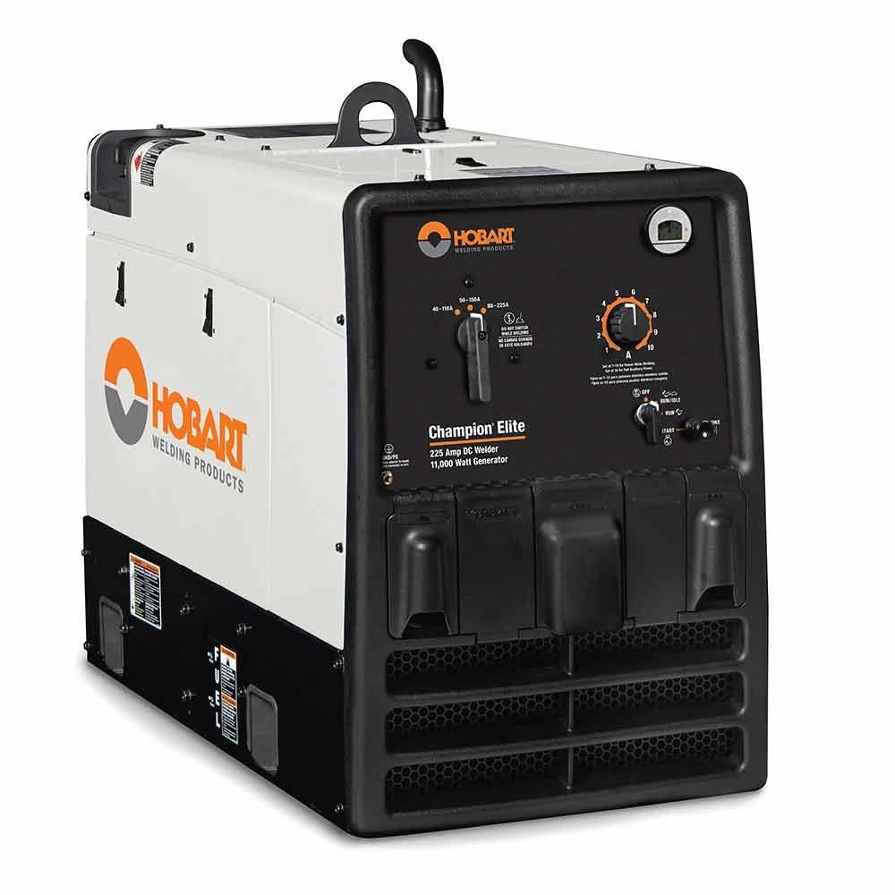 Hobart Champion Elite Welder/Generator is designed to be a jobsite workhorse. Hobart Champion ELITE combines an 11,000 watt generator with a DC welder for general construction and emergency power applications. It features a rugged, fully enclosed case which provides a protective barrier and lowers noise. All receptacles on the ELITE feature push-button reset circuit breakers. Auxiliary power while welding gives you the capability to run other equipment (lights, grinders) at the same time you are welding. Quick set current control, is easy to set up, provides smooth arc starts and maintains optimum arc characteristics. Cables sold separately. The Champion Elite features DC weld output for smooth arc performance and easy starts. There are four 120 volt GFCI (20 amp), one 240V (50 amp) and one 120/24 volt (50 amp) receptacles with push-button reset circuit breakers. This welder/generator is made with heavy-duty construction with 100% duty cycle, fully-enclosed engine design, large batter, rugged electrical connections and wiring. no tools oil change and standard hour meter help maintain routine scheduled oil servicing. The quick set current control, makes set up and start welding easy. The auto-ideal is for greater fuel savings and reduced notice. Ideal for maintenance, construction, farm/ranch, rental and home applications.