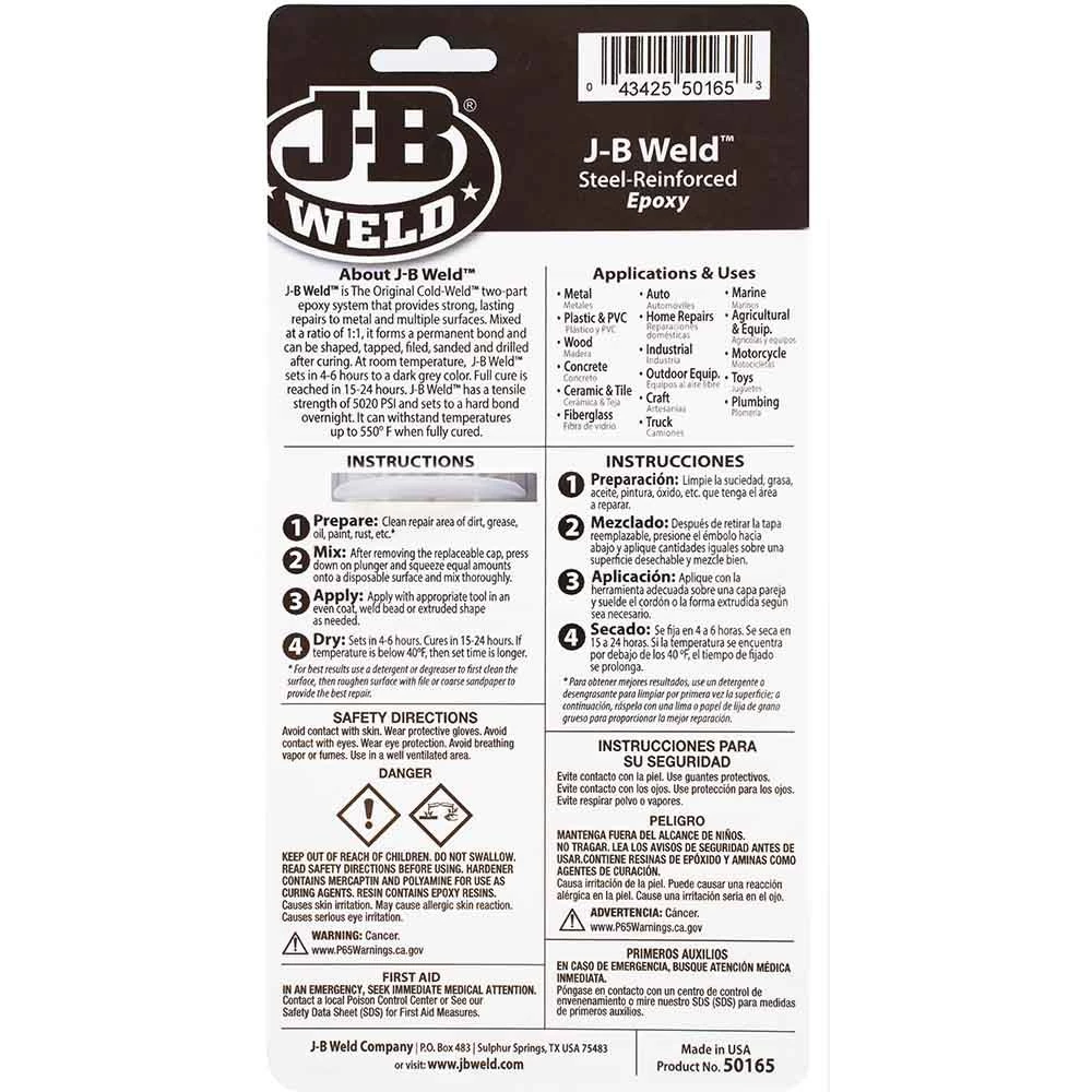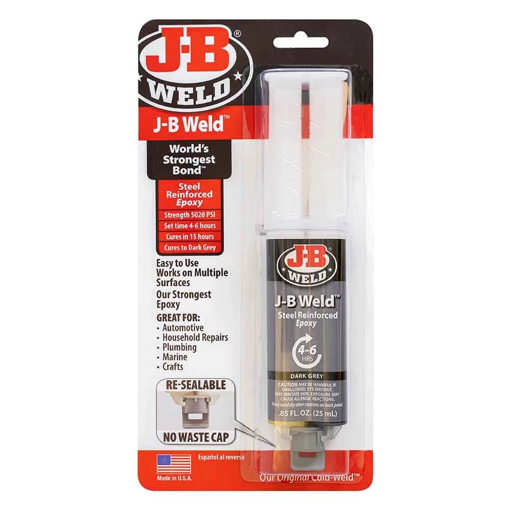 J-B Weld™ Syringe is the original cold-weld™ two-part epoxy system that provides strong, lasting repairs to metal and multiple surfaces. Mixed at a ratio of 1:1, it forms a permanent bond and can be shaped, tapped, filed, sanded and drilled after curing. At room temperature, J-B Weld™ sets in 4-6 hours to a dark grey color. Full cure is reached in 15-24 hours. J-B Weld™ has a tensile strength of 5020 PSI and sets to a hard bond overnight. It can withstand temperatures up to 550⁰ when fully cured.