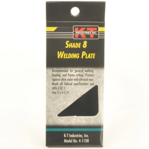K-T 2 x 4 1/4 in. Welding Plate is a great piece of protection. No. 5 and No. 8 are recommended for gas welding or cutting. No. 9 and No. 10 are recommended for arc welding. The higher the number the darker the shade and more protection given.