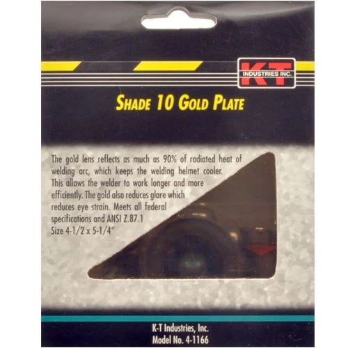 K-T 4 1/2 in. x 5 1/4 in. Gold Filter Plate No. 10 allows the welder to work longer and more efficiently. The gold lens reflects as much as 90% of radiated heat of welding arc which keeps the welding helmet much cooler. It also reduces glare which decreases eye strain.