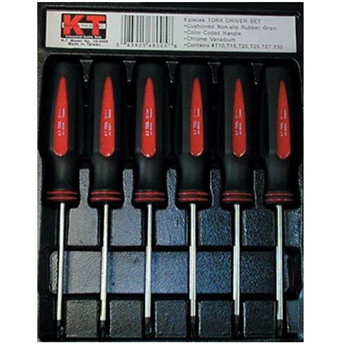 K-T Industries 6 Pc. Professional Torx Driver Set features cushioned non-slip large rubber grips that allow for better grip, more control and maximum turning power. Made of strong chrome vanadium steel with black oxide tips for strength and durability.