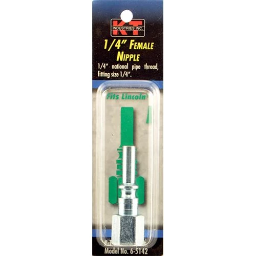 KT Industries Lincoln® 1/4 In. Female Nipple is a 1/4 in. female national pipe thread 1/4 in. nipple. It is interchangeable with most Lincoln® series couplers and plugs produced by other manufacturers. The nipples are plated steel with hardened wear points and are precision machined bar stock construction provides resistance to the effects of mechanical shock in rugged applications.