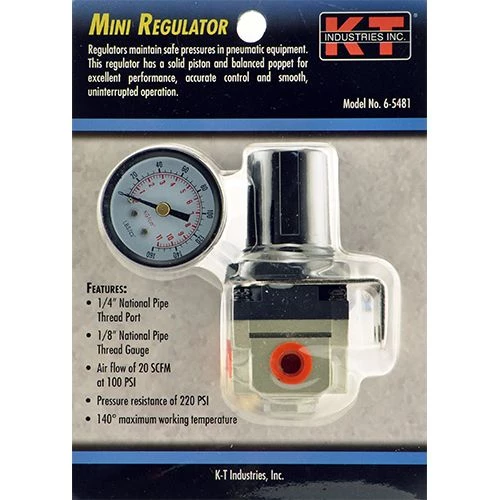 KT Industries Mini Regulator maintains a safe pressure in pneumatic equipment. This regulator has a solid piston and balanced poppet for excellent performance, accurate control and smooth, uninterrupted operation.