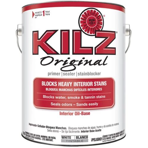 KILZ Original primer is a powerful stainblocking formula that blocks most severe stains including water, smoke, tannin, ink, pencil, felt marker, grease and also seals pet, food and smoke odors. Original may be topcoated with latex or oil-based paint. It seals porous surfaces for uniform finish. Use on: wood, drywall, plaster, paneling, wallpaper, masonry, brick, painted metal and properly prepared glossy surfaces.