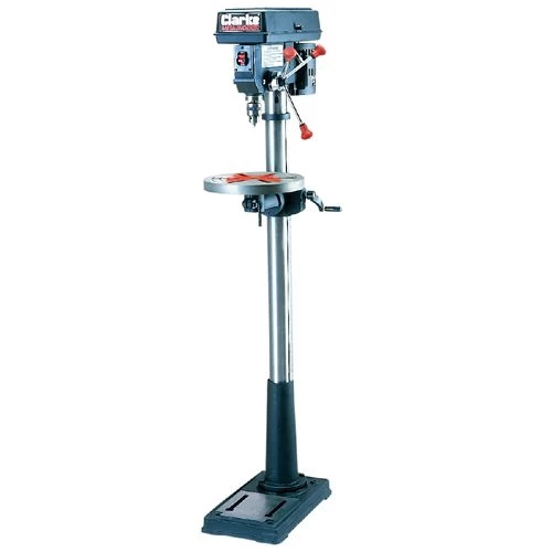 King Floor Drill Press 16 Speed has 16 spindle speeds and 5/8 in. chuck. There is a laser centering beam and build in work light for ease of use. The table has rack and pinion height adjustment and it tilts and rotates with t slots.
