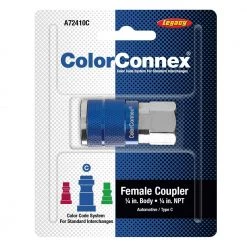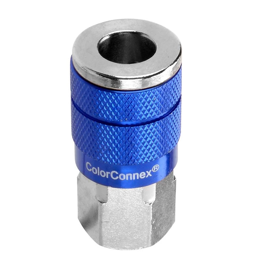 ColorConnex Automotive Series Type C Body Coupler FNPT 1/4 in. is blue in color indicating its use for 1/4 in. thread automotive style fittings. ColorConnex patented color code system allows for easy, color-to-color matching of couplers and plugs among the standard pneumatic interchanges.