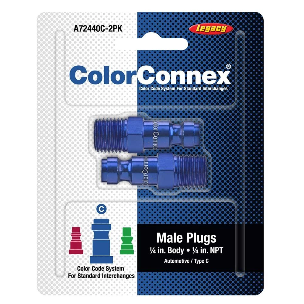 ColorConnex Automotive Series Type C Body Plug 1/4 In. FNPT 2 Pk. is blue in color indicating its use for automotive style fittings. ColorConnex patented color code system allows for easy, color-to-color matching of couplers and plugs among the standard pneumatic interchanges.