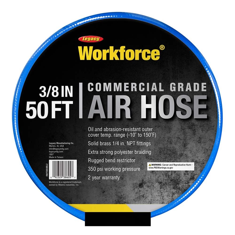 Legacy PVC Air Hose is 3/8 in. ID and ahse 1/4 in MNPT ends and bend restrictors. The inner tube is reinforced with extra strong polyester braiding. It is made from virgin resin Pve giving it excellent flexibiltiy. It is oil and abrasion resistand with ta tempature range of 0 to 140 degrees farhinet.