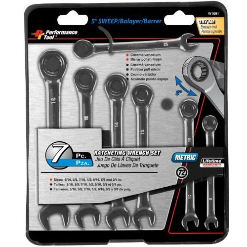 Performance Tools Metric Ratcheting Wrench Set 7 Pc. features 72 gear teeth for 5 degree sweep. It comes with reusable storage rack. Sizes 8, 10, 12, 13, 14, 15 and 18 mm included.