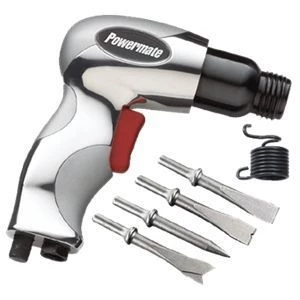 Powermate Air Hammer W/ Chisel is perfect for cutting, chipping, piercing, scraping. The ergonomic handle with two-finger trigger is for improved comfort and control. It has double ball bearing construction. Includes 4 chisels and chisel spring retainer; cold chisel, ripping chisel, punch, panel cutter. Built-in speed control adjusts hammer power. 1/4” NPT air inlet with screened filter keeps out unwanted particles.