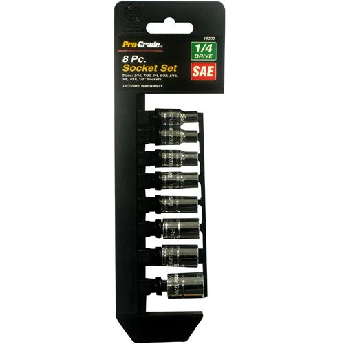 Pro-Grade 1/4 In. Drive SAE Socket Set includes 8 1/4 in. drive 6 point SAE sockets in sizes 3/16, 7/32, 1/4, 9/32, 5/16, 3/8, 7/16, 1/2 in.