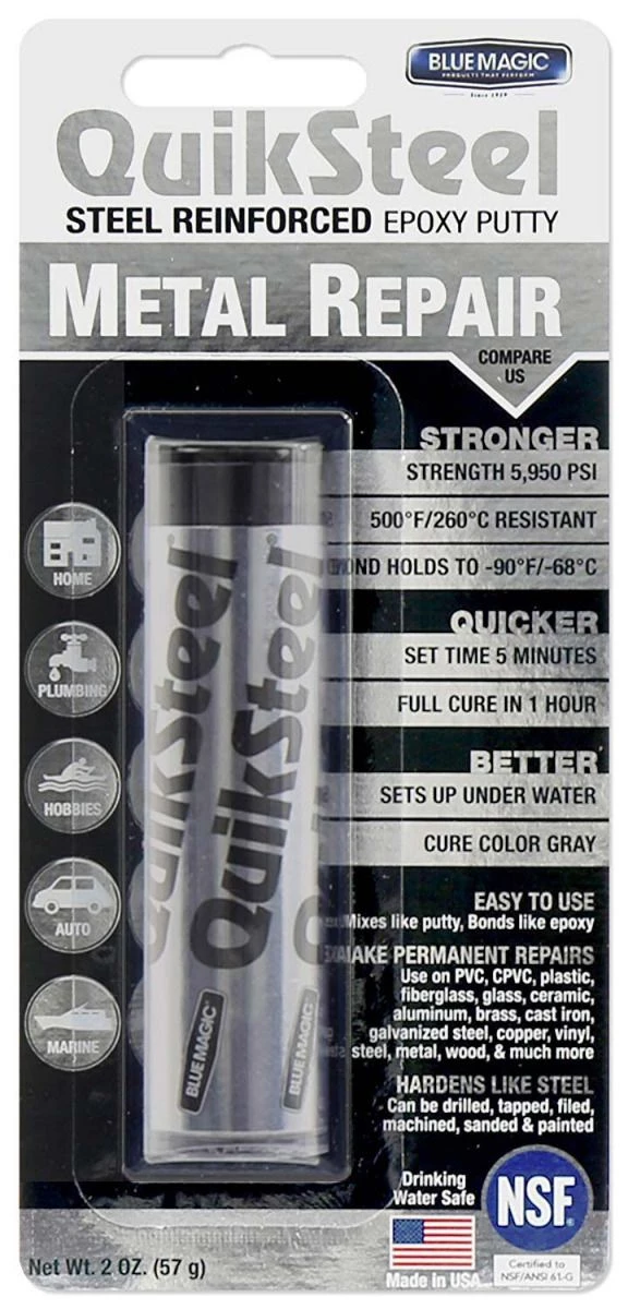 QuikSteel Steel Reinforced Epoxy Putty 2 oz. Blister Pack bonds to all metals, fiberglass, plastics, glass, wood, ceramics, and brick. It sets in 4 to 5 minutes and fullly cures in 1 hour. This epoxy putty can be drilled, tapped, filed, sanded and painted.