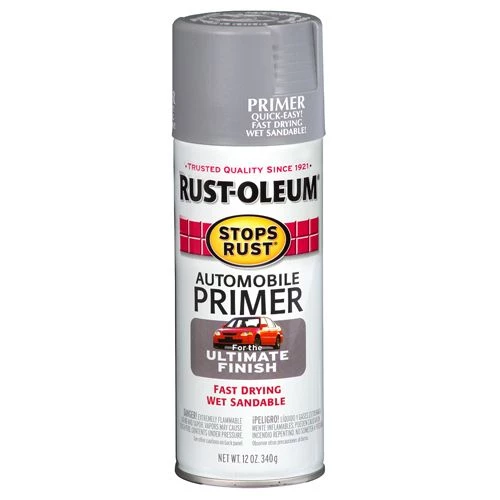 Rust-Oleum Stops Rust Auto Primer Spray Paint Gray 12 Oz. is a tough, rust-inhibiting base that works well under most automotive paints and Rust-Oleum Stops Rust finishes. Spray on and wait just 15 minutes before you apply a top coat or wet sand to an ultra smooth finish. Safe to apply on all but galvanized metals. It features a comfort tip with a wider finger pad to reduce fatigue cause by continuous spraying. In addition, there is an any-angle spray feature that allows you to spray in any direction, even upside down. This primer is fast-drying and wet sandable. It is durable and corrosion-resistant.
