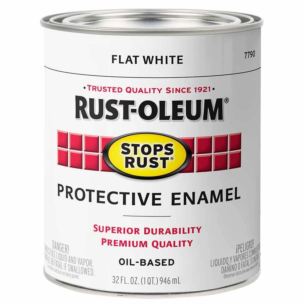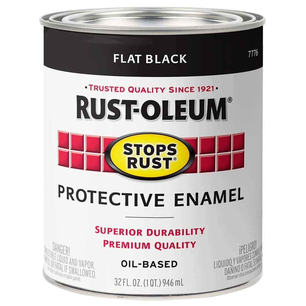 Rust-Oleum® Stops Rust® Flat Protective Enamel 1 Qt. is the #1 rust-preventive paint available. It provides lasting protection and beauty. Apply to metal, wood, concrete or masonry. This paint works great indoor and outdoors, it is durable and corrosion-resistant. The tough protective finish resists fading, cracking chipping and peeling. Apply Stops Rust Enamel to outdoor light fixtures, patio furniture, wheel barrows, railing and mailboxes, door and window trim, bicycles and wagons, wrought iron and door hardware.