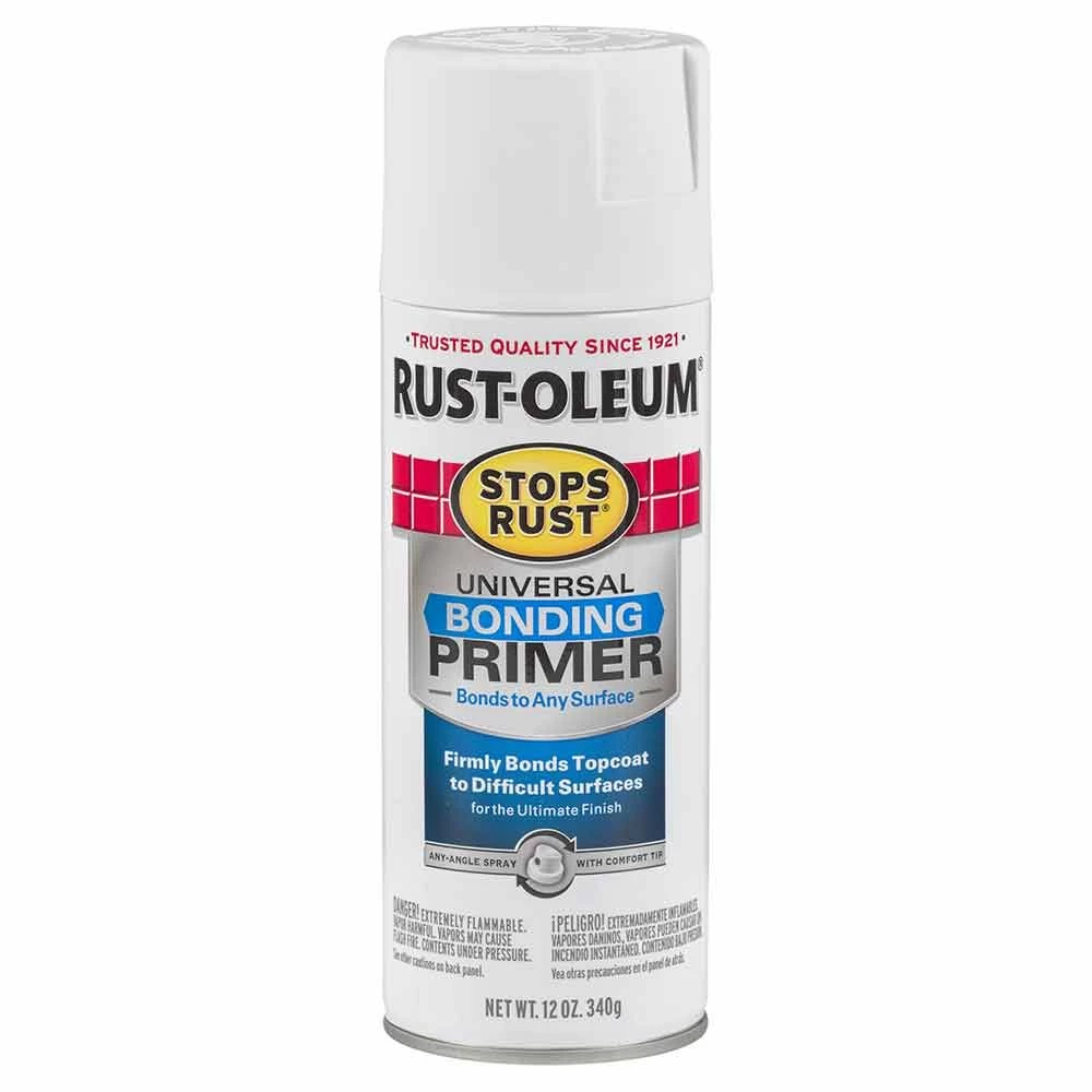 Rust-Oleum® Stops Rust® Universal Bonding Primer 12 Oz. bonds topcoats to even the most difficult to coat surfaces, including galvanized steel and two-part epoxies. It creates a smooth, rust-resistant finish for topcoat application. The can features an any-angle spray system for those hard-to-reach areas and a comfort spray tip to eliminate finger fatigue.