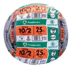 Southwire 10/2 CU UF-B W/G is an outdoor wire used in residential or agricultural buildings for interior branch circuit wiring. Certain applications include outbuildings such as garages and barns and for lamp posts, pumps and other loads or apparatus. 'UF-B' stands fore Underground Feeder Type B Wire. The 'B' denotes the individual conductor insulation is rated 90 degrees C. This wire can be used for wet or dry locations. Indoors it can be use for wet or corrosive location, outdoors for direct burial and in wet basements.