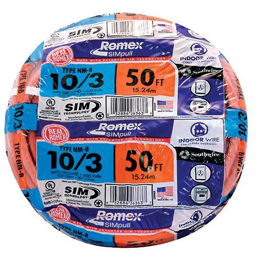 Southwire 10/3 CU NM-B W/G is used for general household wiring. The 'NM' stands for non-metallic, which refers to the flexible, generally PVC sheathing surrounding the cable. The 'B' represents a heat rating of 194° Fahrenheit. Wire is sized by the American Wire Gauge (AWG) system. The larger the number means the smaller the wire. 10/3 wire is for use with larger appliances. NM-B can run behind walls and ceiling, inside floor cavities and other unexposed areas. It is not designed for running along the outside of a wall, such as in an unfinished basement. Use NM-B indoors only, in spaces that are dry and free from moisture. Exposure to water can subject the wires to corrosion. Since the insulation is rated to handle only a certain level of heat, you'll want to avoid placing wires near heat sources such as hot water pipes or heating ducts. Also, do not bury NM-B in cement, concrete, plaster or underground.