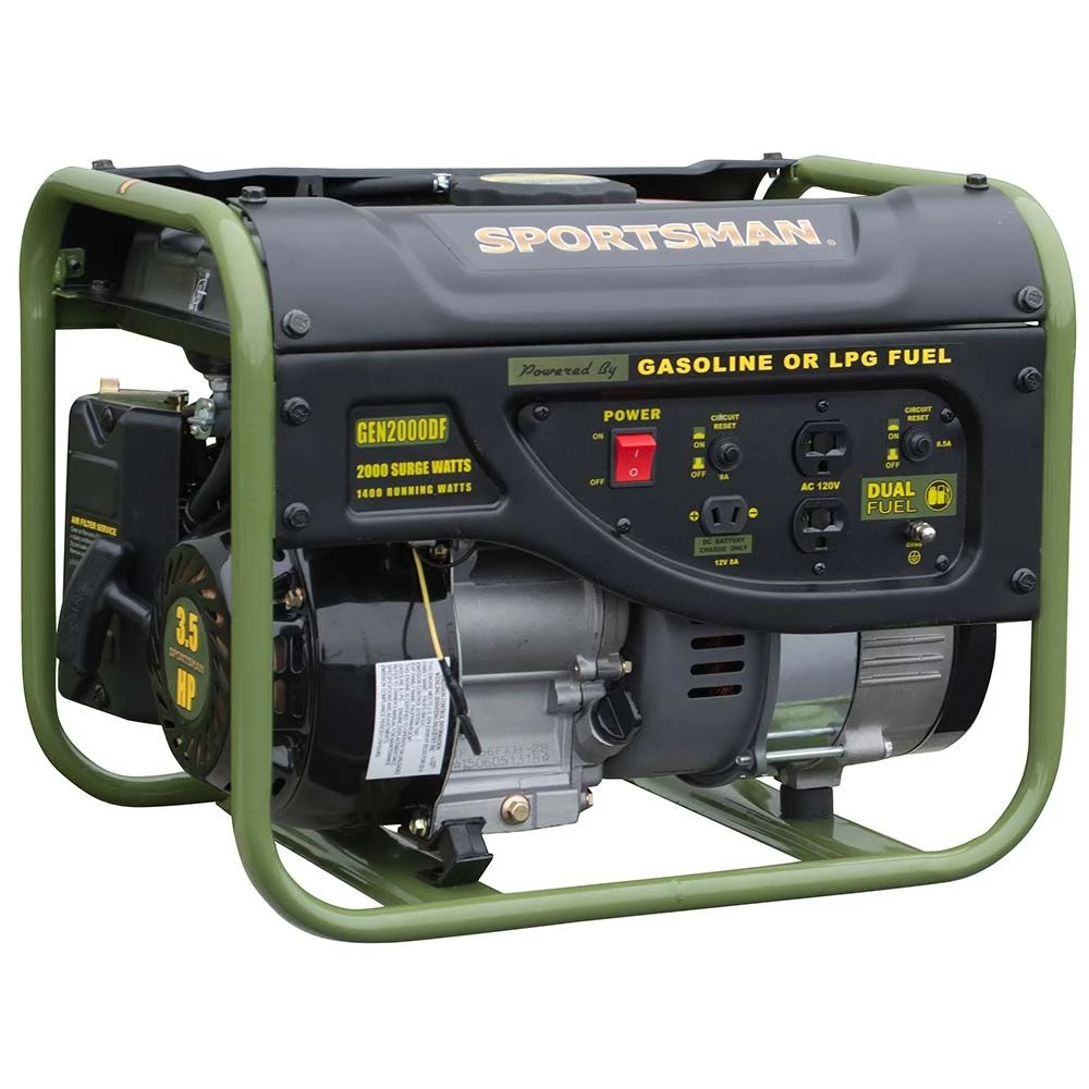 Ideal for tailgating or camping, the Sportsman Series 2000 Watt Dual Fuel Generator has the power and flexibility to handle the task. This generator runs on either unleaded gasoline or propane gas, so you can use whichever fuel is more easily available or affordable at the moment. With the Sportsman Series Dual Fuel Generator, you get the long lasting, clean burning advantage of propane gas, plus the familiar and easy to find benefits of unleaded gasoline. With 2000 peak watts and 1400 rated watts, and equipped with two 120-volt outlets, and a 12 volt DC outlet for battery charging the Sportsman Series Dual Fuel Generator can handle small household appliances, perfect for recreational activities. With a 50 percent load, the Sportsman Series 2000 Watt Dual Fuel Generator can run for 9 hours on a full tank of gasoline (1.2 gallons) and 12 hours with a full 20 lbs. LP cylinder (the common gas grill type, not included). A 5-foot propane fuel hose with a regulator is included for your added convenience. The 3.5 HP engine is surprisingly quiet; it runs at less than 68 Db. The Sportsman Series 2000 Watt Dual Fuel Generator is ideal for anyone who needs affordable, flexible, and portable power. Unfortunately, this model cannot be converted to operate with natural gas. EPA approved, Non-CARB compliant/Not for sale in California