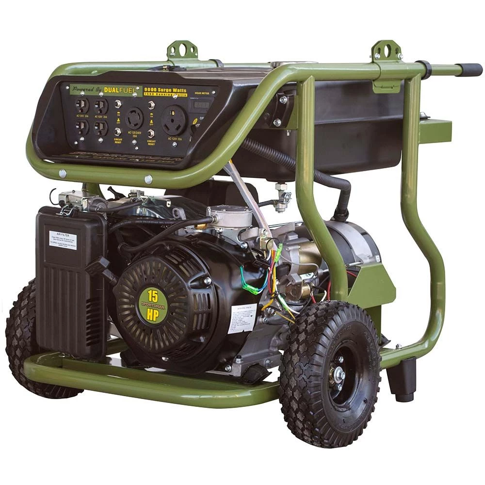 Great for running the RV while out on the road, or for keeping essential appliances going during a power outage, the Sportsman Series 9,000 Watt Dual Fuel Generator has the power and flexibility to handle the task. This generator runs on either unleaded gasoline or propane gas, so you can use whichever fuel is more easily available or affordable at the moment. With the Sportsman Series 9000 Watt Dual Fuel Generator, you get the long lasting, clean burning advantage of propane gas, plus the familiar and easy to find benefits of unleaded gasoline. With 9000 peak watts and 7500 rated watts the Sportsman Series Dual Fuel Generator is a powerful generator than can handle the needs of most contractors, homeowners and recreational activities. Equipped with four 120 volt outlets, one 120/240V twist lock outlet, and a single 120V RV outlet, this generator can run just about anything. Use the generator right out of the box with the recoil start or install a motorcycle battery (not included) to activate the electric start feature. The Sportsman Series 9000 Watt Dual Fuel Generator boasts an engine run time of 10 hours at 50% on 8 gallons of unleaded gas or 5 hours at 50%on a common 20Lb (gas grill type) cylinder (LPG cylinder not included). The 15 HP engine is surprisingly quiet; it runs at less than 80 Db with no load. The Sportsman Series 9000 Watt Dual Fuel Generator is ideal for anyone who needs affordable, flexible, and portable power. Unfortunately, this model cannot be converted to operate with natural gas. EPA approved, Not available for sale in California Gas and propane tank not included
