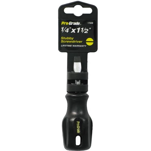 Pro-Grade Stubby Screwdriver 1/4 In. x 1-1/2 In. features a narrow, precision-machined flat tip that resists "cam-out" and an ergonomic, oversized handle. The driver blade is made from chrome vanadium alloy with a satin-chrome finish.