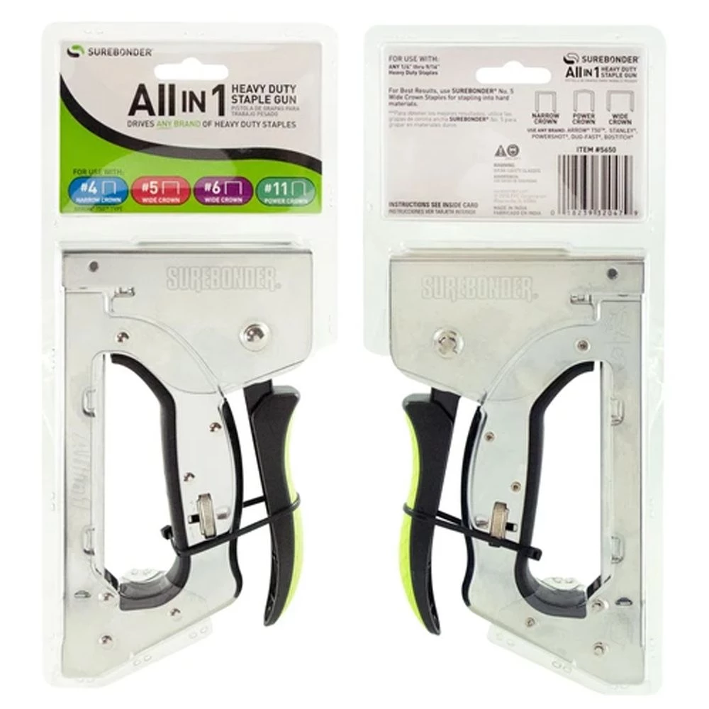 Surebonder All-In-1 Heavy Duty Staple Gun uses any brand or size of heavy duty staples. Uses any standard type heavy duty staples Surebonder no.4, no.5, no.6, no.11 heavy duty staples or Arrow T50, Powerfast, Stanley, Duo-Fast, Bostitch, Craftsman, Master Mechanic, Do-it, Ace Hardware, Black & Decker, and Unifix staples. Easy drop in staple loading and cushioned non-slip grip. Viewing window lets you know if you need to load staples. Patent pending.